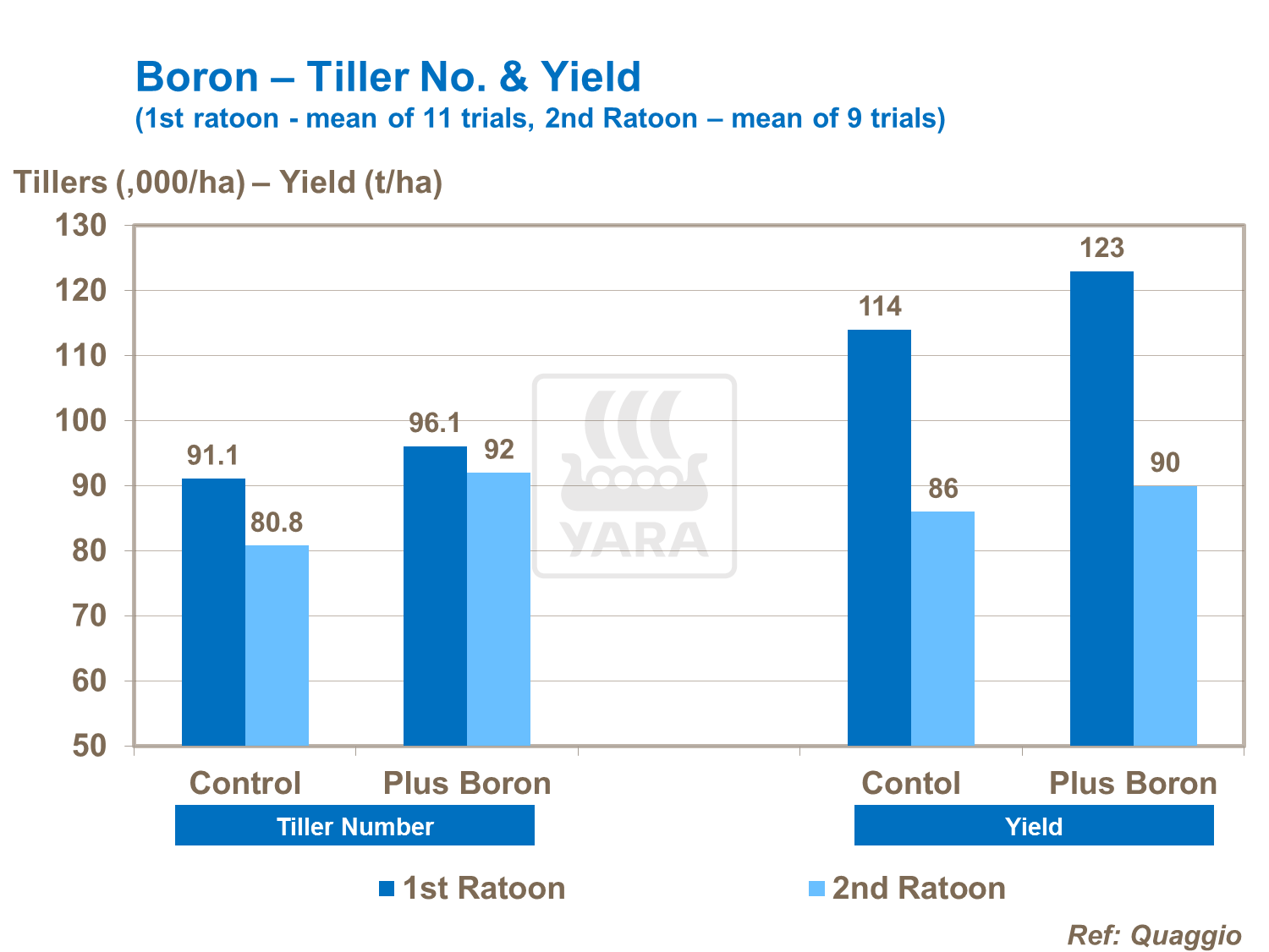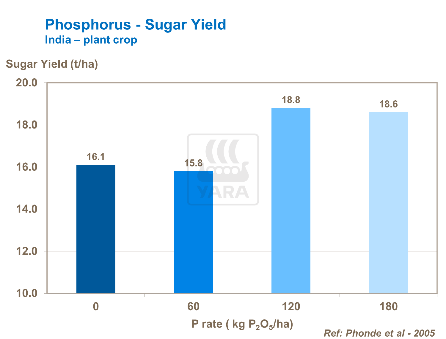 Phosphorus has a direct effect on sugar yield, not only through increasing physical yield, but also by increasing sucrose content in the harvested cane. It can also result in poor clarity in cane juice.
