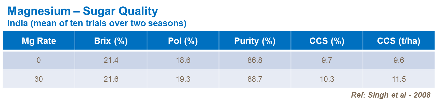 Sugar is also influenced by magnesium supply and sucrose content is reduced where Mg nutrition is inadequate